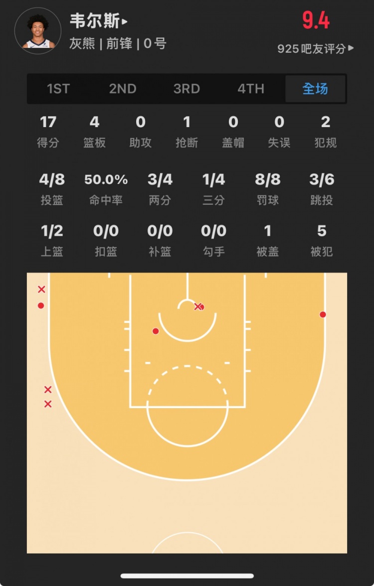 灰熊39號秀 杰倫-韋爾斯 登場(chǎng)27.5分鐘