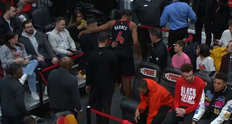 又雙傷了!斯科蒂-巴恩斯落地腳尖與莫格博對了一下 崴腳回更衣室