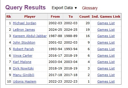 根據數據統計,這是詹姆斯40歲后的第20次20+,他追平喬丹,并列40歲之后20+場(chǎng)次排行榜第一。