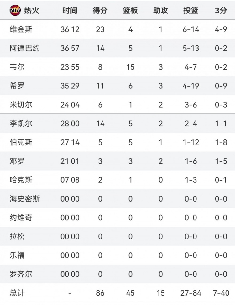 2月25日訊 NBA常規賽,熱火86-98不敵老鷹。本場(chǎng)比賽,熱火全隊三分手感冰涼。全隊外線(xiàn)共計40中7,僅有維金斯和李凱爾手感在線(xiàn)(維金斯9中4、李凱爾1中1)。 標簽: 籃球 NBA 熱火 維金斯 李凱爾