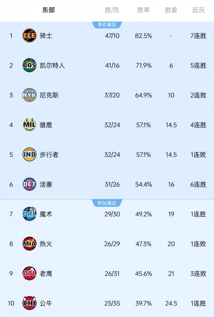 至此,步行者戰績(jì)來(lái)到32勝24負,被戰績(jì)相同的雄鹿擠掉(本賽季雙方已交手2次、雄鹿都獲勝),排名下滑到東部第五。