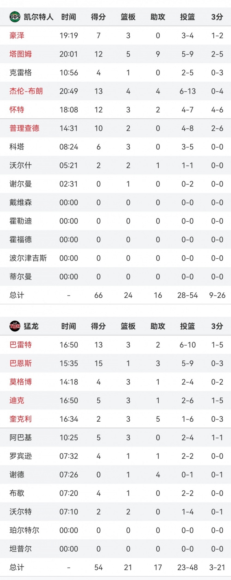 凱爾特人半場(chǎng)66-54領(lǐng)先猛龍12分 全隊4人得分上雙