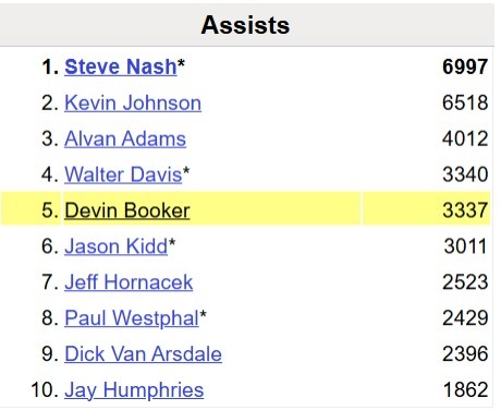 這樣一來(lái),布克太陽(yáng)生涯助攻數達到3341,超越沃爾特-戴維斯升至隊史第4。
