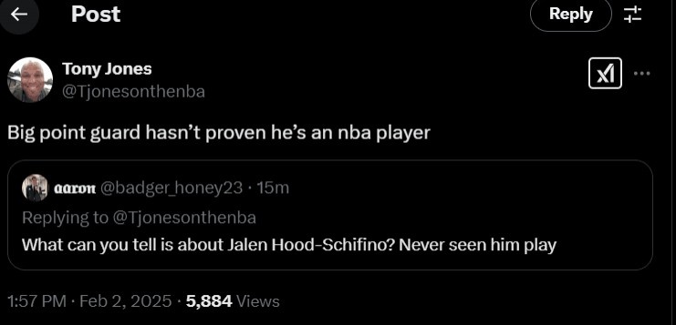 記者Tony Jones回復道:高大的控球后衛(198cm)還未能證明自己具備N(xiāo)BA球員的實(shí)力。