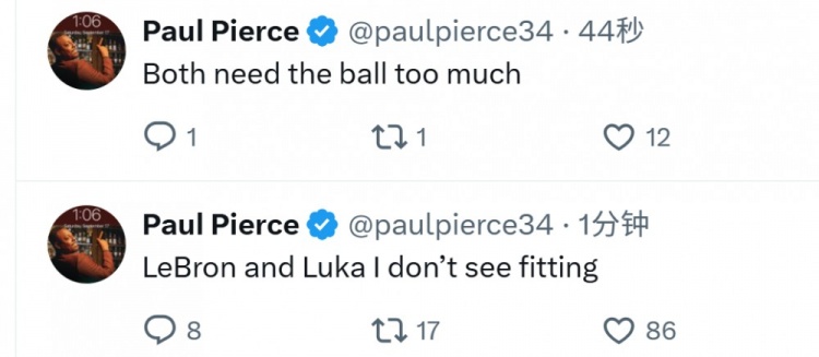 名宿皮爾斯發(fā)推寫(xiě)道:“我認為詹姆斯和東契奇不合適,他倆都需要大量持球?!?/p>