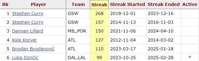 據統計,東契奇目前已經(jīng)連續100場(chǎng)比賽有三分入賬,是歷史上第5位做到的球員。