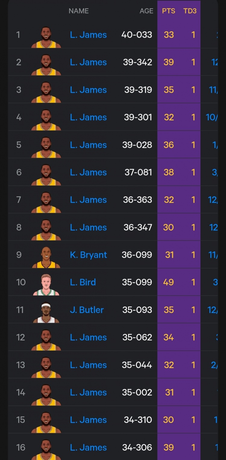 至此,40歲33天的詹姆斯再次刷新了自己保持的“聯(lián)盟砍三雙最老的球員”紀錄,原先紀錄是在詹姆斯39歲342天的時(shí)候創(chuàng )下。