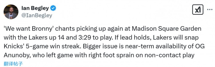 2月2日訊 NBA常規賽,湖人末節領(lǐng)先尼克斯兩位數。據尼克斯隊記Ian Begley報道,比賽第四節末段,尼克斯主場(chǎng)球迷喊起了“我們要布朗尼”。 標簽: 籃球 NBA 湖人 布朗尼 尼克斯