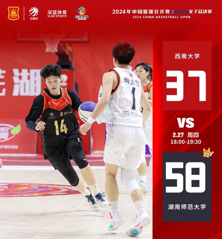 上半場(chǎng),在開(kāi)局短暫僵持后,湖南師范大學(xué)開(kāi)始進(jìn)攻,15號劉嘉芳后場(chǎng)籃板拼搶積極,6號沈思榆、1號何佳欣兩分命中,湖南師范大學(xué)22-8領(lǐng)先西南大學(xué)。次節湖南師范大學(xué)繼續高歌猛進(jìn),多次搶斷快攻打成。半場(chǎng)結束,湖南師范大學(xué)36-20領(lǐng)先。下半場(chǎng),西南大學(xué)手感欠佳,兩節只得到17分,最終湖南師范大學(xué)58-37戰勝西南大學(xué)。
