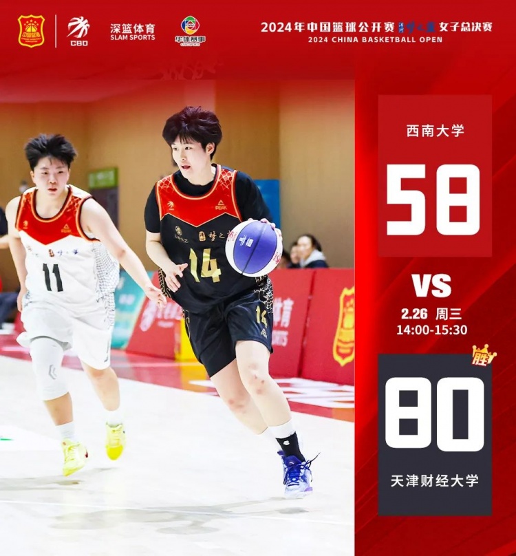 上半場(chǎng)首節,兩隊打得相對膠著(zhù),比分緊咬。第二節,西南大學(xué)手感欠佳,單節只得到9分。天津財經(jīng)大學(xué)則保持著(zhù)不錯的進(jìn)攻勢頭,單節拿到25分。半場(chǎng)結束,天津財經(jīng)大學(xué)37-24領(lǐng)先西南大學(xué)。下半場(chǎng),西南大學(xué)7號應茵、12號莫琇雅前后場(chǎng)籃板拼搶積極,但無(wú)奈前期存在一定差距,最終西南大學(xué)58-80不敵天津財經(jīng)大學(xué)。