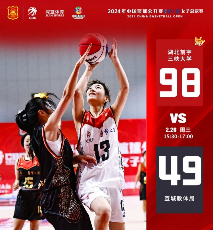 上半場(chǎng),湖北前宇三峽大學(xué)11號劉欣怡、2號張歡分別命中兩分,幫助球隊取得領(lǐng)先。宣城教體局6號張紫涵扳回兩分后,湖北前宇三峽大學(xué)在技術(shù)和經(jīng)驗上的優(yōu)勢逐漸顯露,打出一波8-0的得分潮。半場(chǎng)結束,湖北前宇三峽大學(xué)53-21領(lǐng)先宣城教體局。易邊再戰,宣城教體局雖然頑強拼搏,但年輕小將在實(shí)力上和對手還是存在著(zhù)差距,將分差越拉越大。最終,湖北前宇三峽大學(xué)98-49戰勝宣城教體局。