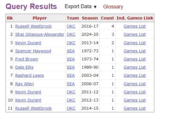 根據數據統計,這是亞歷山大本賽季第4次砍下50+,他追平威少,并列雷霆隊史單賽季50+場(chǎng)次榜榜首。