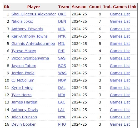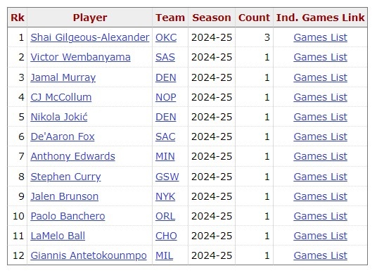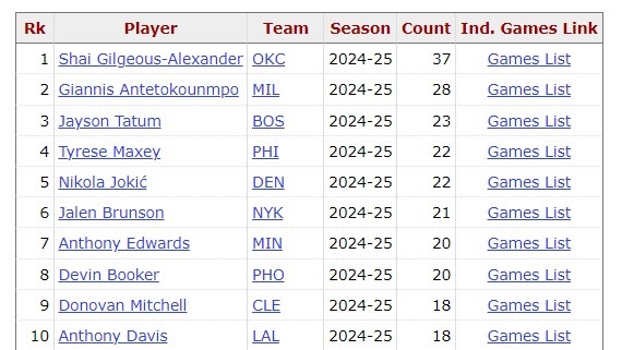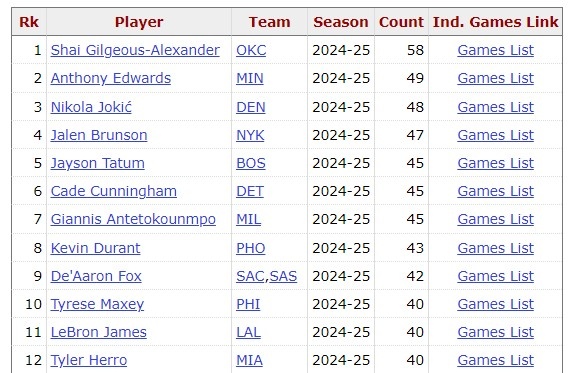 SGA目前59場(chǎng)20+,聯(lián)盟第一!