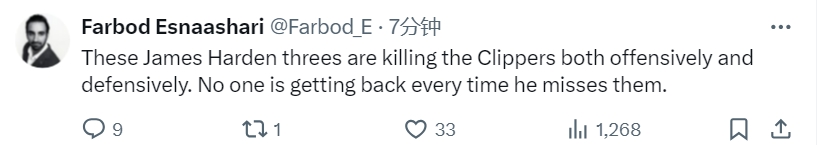 船記Farbod Esnaashari發(fā)推:“哈登這些三分球在攻防兩端都在殺死快船,當他打鐵的時(shí)候,每個(gè)人都退不回來(lái)?!?/p>