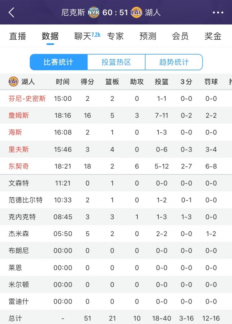 上半場(chǎng)比賽,湖人外線(xiàn)投射不在線(xiàn),射手也不準,全隊16投僅3中,命中率僅18.8%:東契奇7中2,克內克特3中1,詹姆斯2中0,里夫斯3中0,范德比爾特1中0。