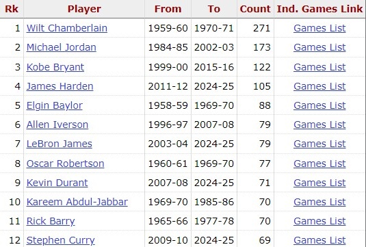據統計,這是庫里生涯第70場(chǎng)比賽40+,追平賈巴爾和里克巴里,并列歷史第10。