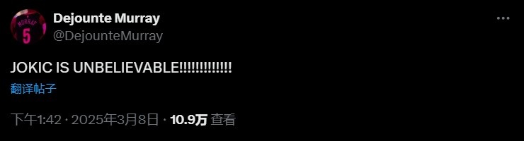 賽后,鵜鶘后衛德章泰-穆雷更推寫(xiě)道:約基奇實(shí)在太不可思議了!