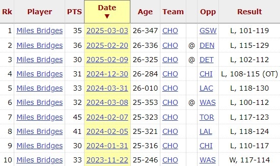 值得一提的是,邁爾斯-布里奇斯在過(guò)去10場(chǎng)拿到30+的比賽全輸了。