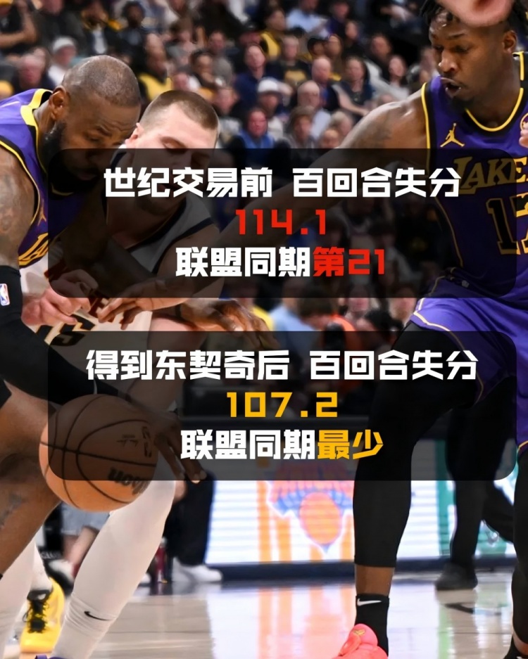 而比起進(jìn)攻端如虎添翼,令人驚訝的是,他們在防守端更是打出了前所未有的質(zhì)量。在一個(gè)被質(zhì)疑“防守有巨大問(wèn)題”的東契奇加入之后,湖人隊反而成為百回合失分同期最少的球隊。他們每百回合足足少丟了6.9分,成為交易日后聯(lián)盟獨一檔的防守鐵軍。