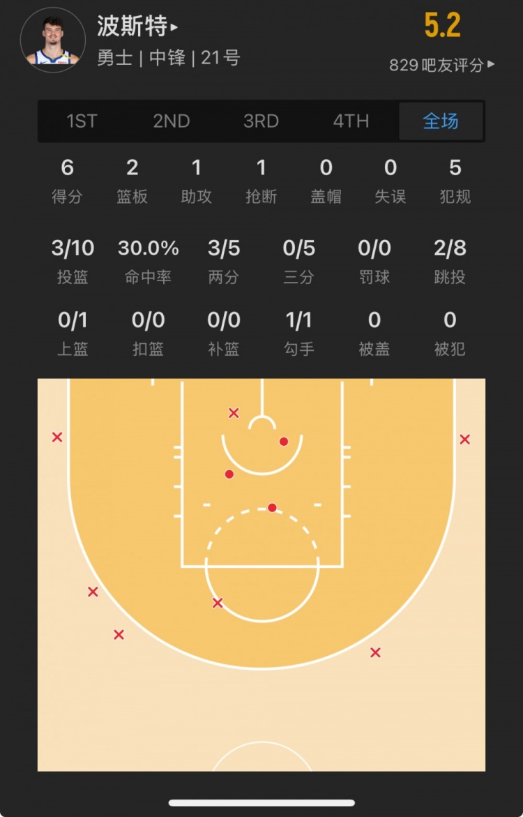 勇士52號秀 昆滕-波斯特 登場(chǎng)20.2分鐘
