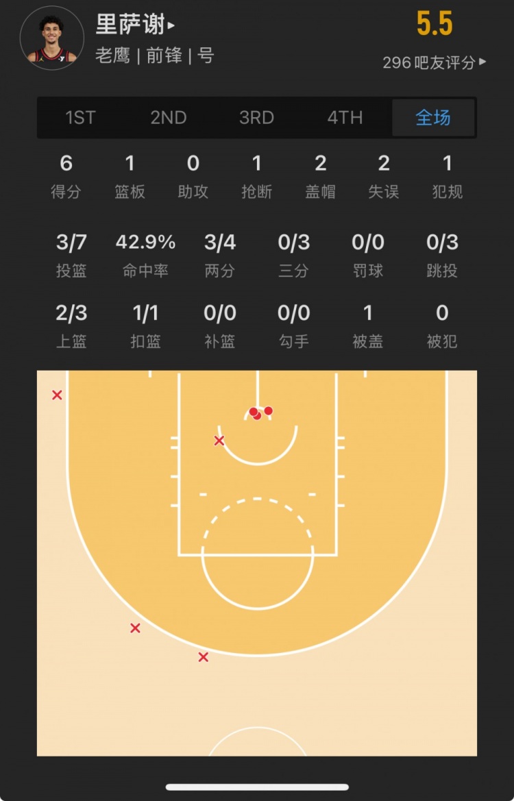老鷹狀元秀 扎卡里-里薩謝 登場(chǎng)22.3分鐘