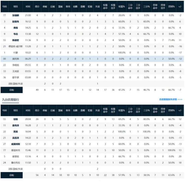上半場(chǎng)比賽,遼寧全隊一共出現了14次失誤,而吉林全隊的失誤數為10次。