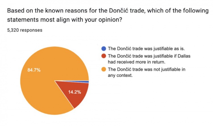 參與問(wèn)卷調查的5320名球迷中,84.7%的球迷認為東契奇交易在任何情況下都說(shuō)不過(guò)去,14.2%的球迷認為如果獨行俠獲得更多的回報,那么東契奇交易說(shuō)得過(guò)去,認為東契奇交易說(shuō)得過(guò)去的球迷只占1.1%。