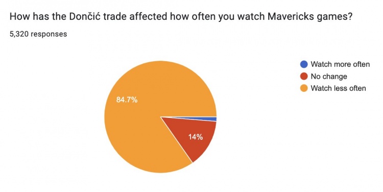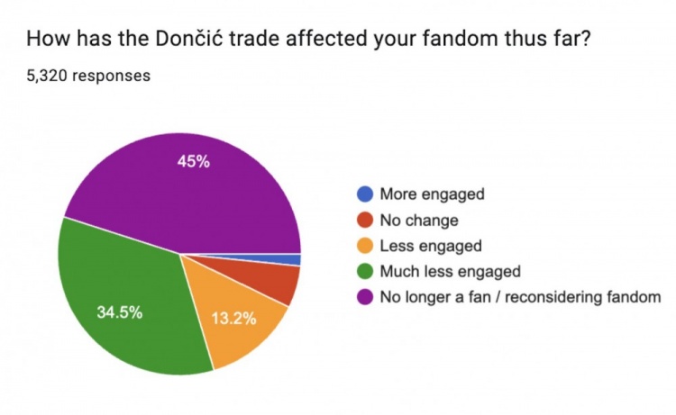 在東契奇交易如何影響你對球隊的喜愛(ài)這個(gè)問(wèn)題上?45%的球迷表示不再是一名球迷或者要重新考慮自己的喜愛(ài)程度;34.5%表示自己現在參與度低多了,13.2%的球迷表示自己參與度略有降低,只有7.3%的球迷表示自己的喜愛(ài)度沒(méi)有變化或者參與度更高了。