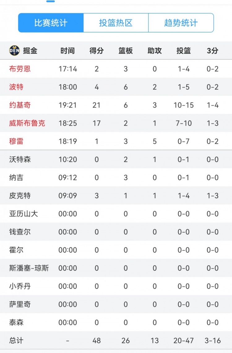 上半場(chǎng),掘金除約基奇和威少外均表現不佳,全隊半場(chǎng)47投20中,約基奇和威少25投17中,其他人合計22投僅3中,其中賈馬爾-穆雷個(gè)人7投0中。