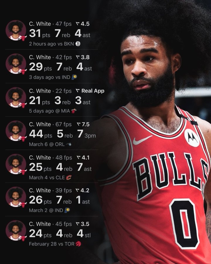 此役公牛后衛科比-懷特火力全開(kāi),打了36分鐘24投12中,三分8中3、罰球4中4砍全場(chǎng)最高31分外加7籃板4助攻1搶斷,正負值+7。