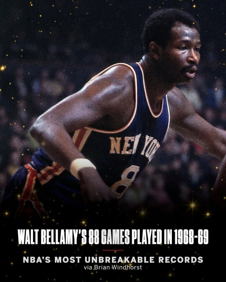 1968-69賽季,沃爾特-貝拉米起初效力于尼克斯,打了35場(chǎng)比賽。隨后他被交易到活塞,由于賽程安排的特殊性,他在活塞又打了53場(chǎng)比賽,使他的賽季總出場(chǎng)數達到了88場(chǎng)。NBA歷史上共有42次球員單賽季出場(chǎng)數超過(guò)82場(chǎng),最近一次是上賽季的希爾德,效力步行者和76人共計84場(chǎng)比賽。歷史上僅次于貝拉米的是湯姆-亨德森,后者在1976-77賽季為子彈隊和老鷹共打了87場(chǎng)比賽。