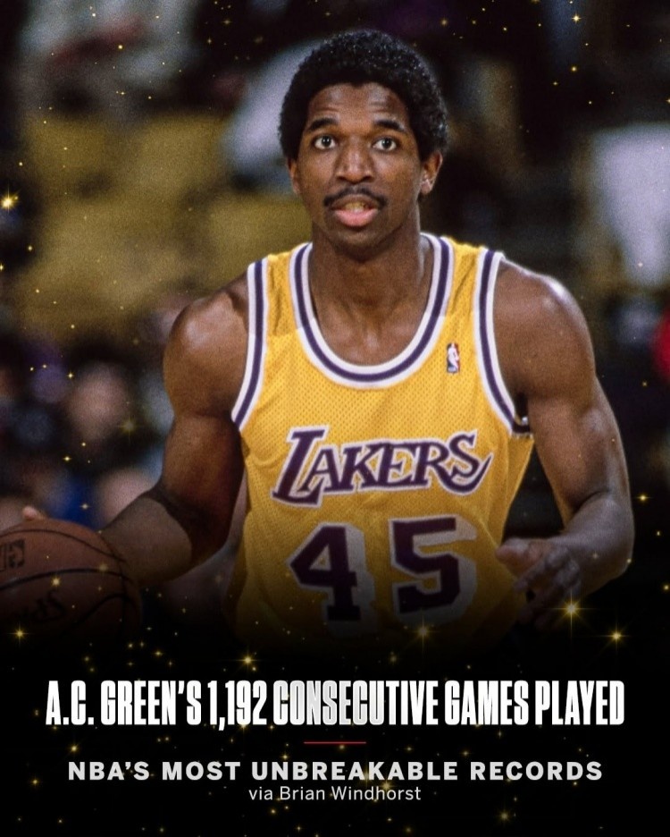 AC-格林從1986年到2001年連續16個(gè)賽季保持全勤,期間效力于四支不同的球隊。他打破了蘭迪-史密斯從1972年到1982年保持的906場(chǎng)連續出場(chǎng)紀錄。現年28歲的尼克斯球員米卡爾-布里奇斯職業(yè)生涯至今從未缺席過(guò)比賽,過(guò)去七年連續出場(chǎng)539場(chǎng)。如果他想追上AC-格林的紀錄,還需要在未來(lái)近八個(gè)完整賽季中保持全勤。