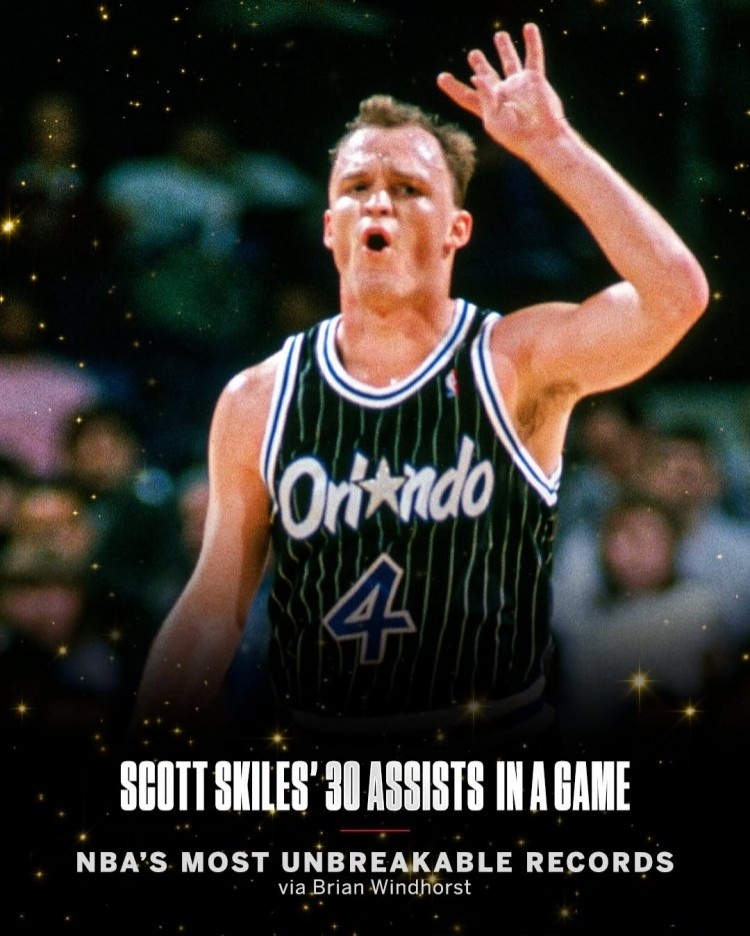 這一紀錄已經(jīng)經(jīng)受住了時(shí)間的考驗,自1990年12月30日以來(lái),塵封了超過(guò)30年。斯凱爾斯在那場(chǎng)比賽第四節的前六分鐘一直停留在29次助攻,追平了凱文-波特在1978年創(chuàng )下的紀錄。直到比賽最后一分鐘,他才送出第30次助攻,成功打破了紀錄。斯凱爾斯在那個(gè)賽季場(chǎng)均助攻8.4次,后來(lái)還曾單場(chǎng)送出20次助攻。那個(gè)夜晚斯凱爾斯個(gè)人得到22分,率領(lǐng)魔術(shù)以155分的隊史最高得分戰勝了掘金。近年來(lái)最接近這一紀錄的是2017年的拉簡(jiǎn)-隆多,效力鵜鶘時(shí)單場(chǎng)送出25次助攻。過(guò)去10個(gè)賽季里,只有隆多和威少曾單場(chǎng)送出超過(guò)22次助攻。