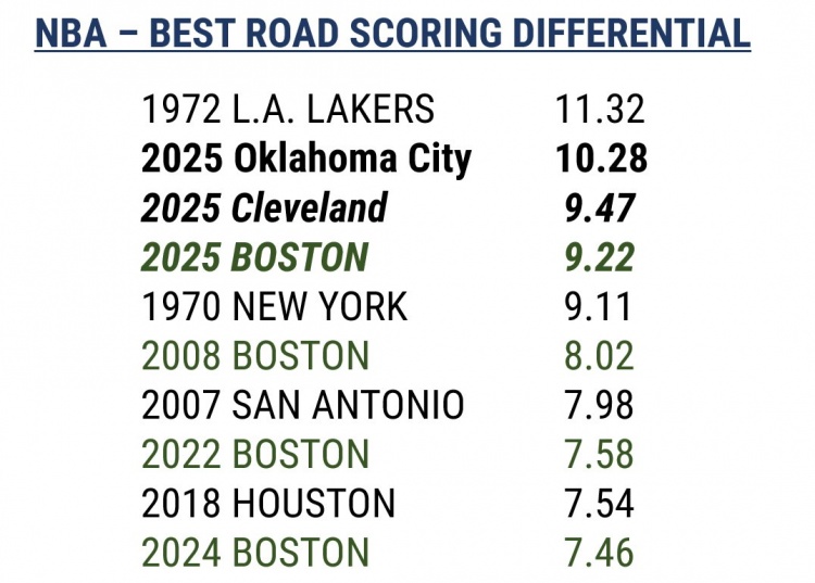 據統計,NBA歷史單賽季客場(chǎng)比賽場(chǎng)均凈勝分排行榜如下: