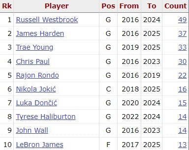 據統計,這是威少過(guò)去10個(gè)賽季以來(lái),第50次半場(chǎng)助攻上雙,為同期最多,哈登以37次排第二。