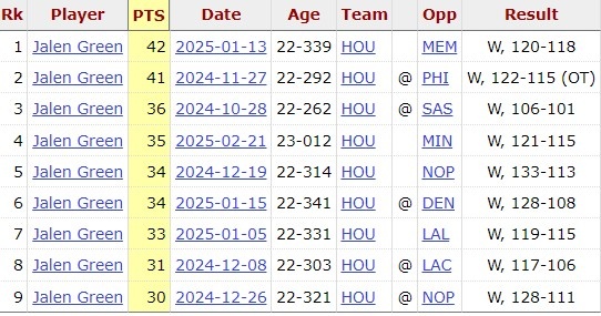 據統計,這是杰倫-格林本賽季第10場(chǎng)30+,而這10場(chǎng)火箭全勝!