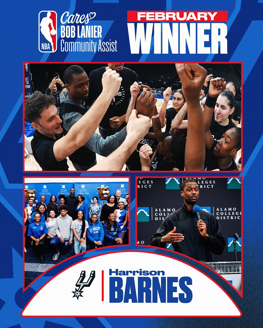 圣安東尼奧馬刺隊前鋒哈里森-巴恩斯被評為2月份的NBA“鮑勃-蘭尼爾”社區關(guān)懷援助獎(Bob Lanier Community Assist Award)得主。巴恩斯和他的妻子布列塔尼向阿拉莫承諾項目(AlamoPROMISE)捐贈了25萬(wàn)美元,該項目為符合條件的貝薩縣學(xué)生支付學(xué)費和雜費。