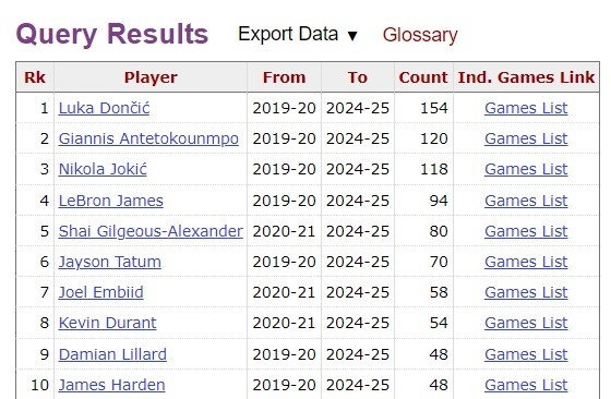 在2020年以來(lái)的30+5+5榜單上,東契奇目前以155場(chǎng)高居第一,字母哥120場(chǎng)第2,約基奇118場(chǎng)第3。