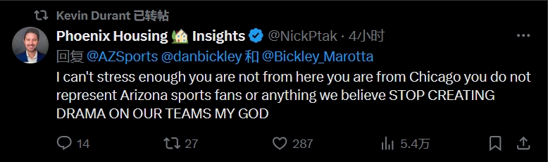球迷一:我簡(jiǎn)直不能更強調這一點(diǎn),你不是本地人,你是芝加哥人,不能代表亞利桑那州的體育迷,也不能代表我們的任何想法。停止在我們的球隊制造鬧劇吧,老天??!