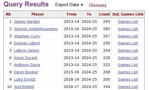 據統計,哈登是2014年以來(lái),聯(lián)盟中砍下30+場(chǎng)次數最多的球員,算上今天已有294場(chǎng)。字母哥、庫里分列2、3位。