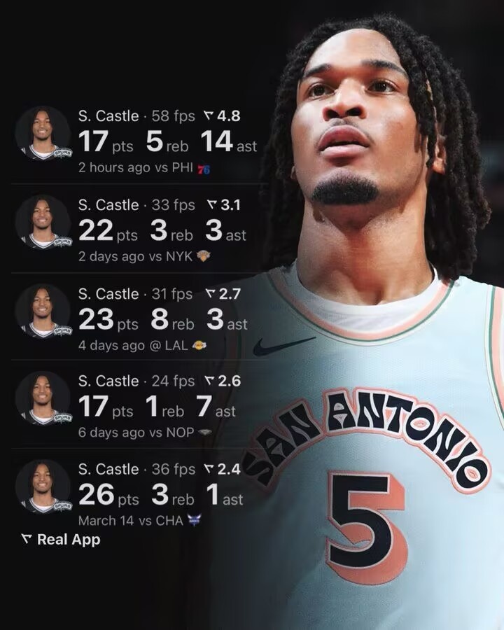 此役,馬刺新秀卡斯爾出戰35分鐘,14中6得到17分5板14助3斷。