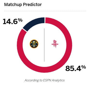 賽前ESPN給出了兩隊本場(chǎng)比賽的勝率:火箭85.4%、掘金14.6%。