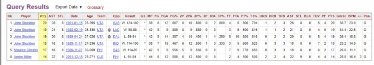 在NBA歷史上,只有三名球員在送出17次助攻的同時(shí)送出8次搶斷,分別是斯托克頓(4次),奇克斯(1次)、安德烈-米勒(1次)。