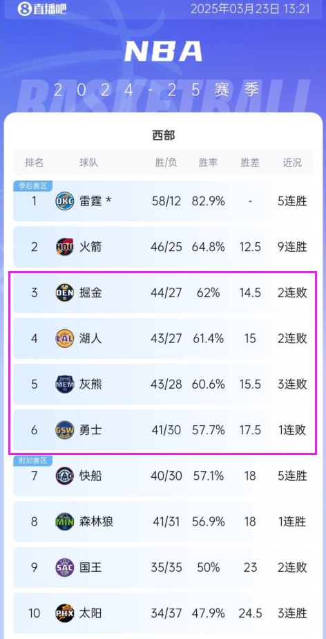 西部第3的掘金、第4的湖人、第5的灰熊和第6的勇士最近都在輸球;第7的快船打出5連勝,森林狼位居第8,兩隊都和第6的勇士(季后賽直通區)只差0.5個(gè)勝場(chǎng);第2的火箭豪取一波9連勝穩住目前的排位;雷霆此前已經(jīng)鎖定西部第一的位置。
