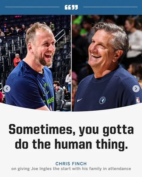 正因如此,當芬奇知道雅各布還會(huì )接著(zhù)觀(guān)看這一場(chǎng)與鵜鶘的比賽之后,他不想給英格爾斯和雅各布留下任何的遺憾。他首先找到了從爵士時(shí)期就與英格爾斯共事的老隊友康利,康利早就了解英格爾斯家庭的困境,毫不猶豫地表示支持,并主動(dòng)讓出了自己的首發(fā)位置。