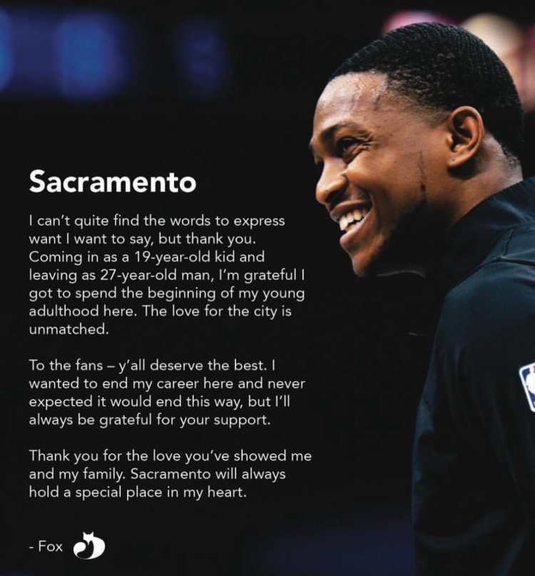 致球迷們,你們理應得到最好的。我本想在這里結束職業(yè)生涯,從未料到會(huì )以這樣的方式離開(kāi),但我會(huì )永遠感激你們的支持。感謝你們給予我和我家人的愛(ài)。薩克拉門(mén)托在我心中永遠有一個(gè)特殊的位置。