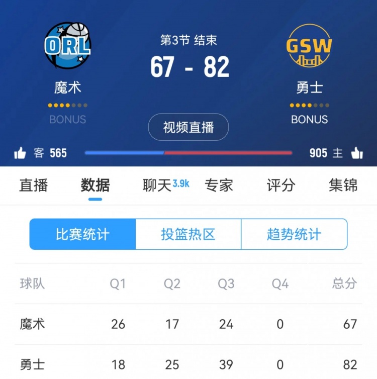 第三節,勇士火力全開(kāi),攻防兩端壓制對手,單節39-24凈勝魔術(shù)15分,而上半場(chǎng)勇士?jì)H得到43分。