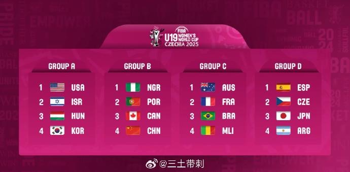 2月4日訊 2025年U19女籃世界杯分組抽簽結束,中國女籃分到了B組,同組的有尼日利亞、葡萄牙、加拿大。具體分組如下: