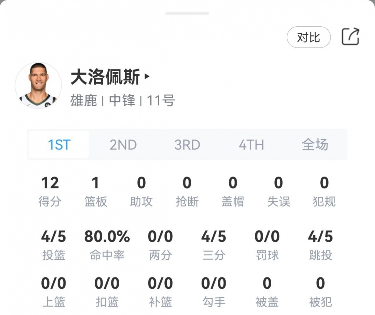 第一節,雄鹿中鋒大洛佩斯手感火熱,半節的時(shí)間三分5投4中獨得12分,幫助球隊占據主動(dòng)。