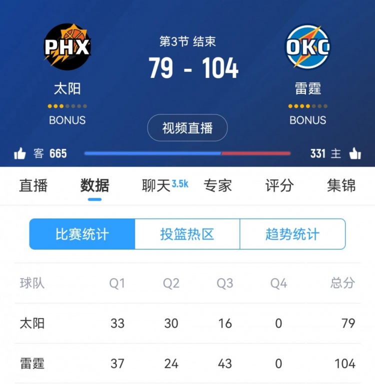 第三節,雷霆攻防兩端壓制對手,單節43-16凈勝太陽(yáng)27分,三節打完雷霆領(lǐng)先25分。